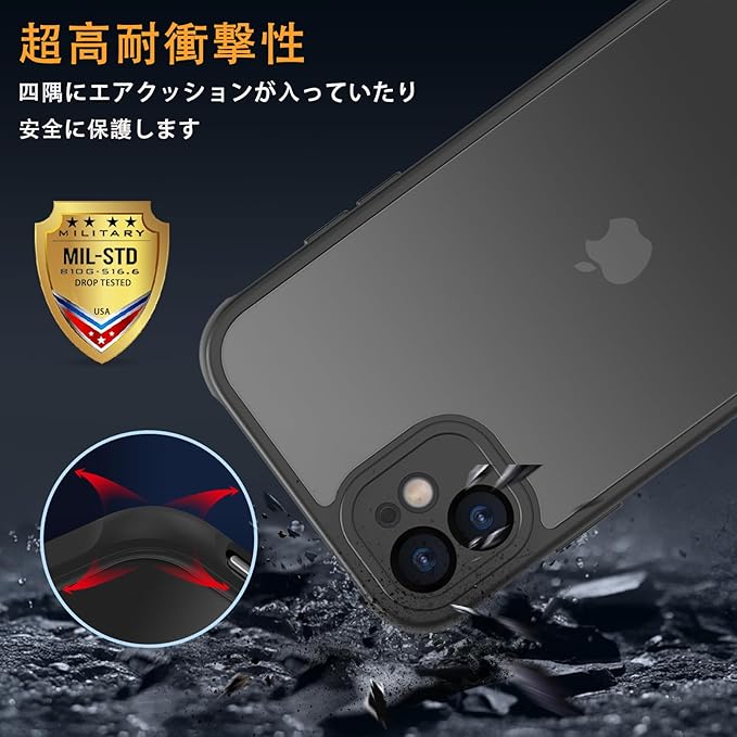 iPhone12mini 用 ケース 半透明 耐衝撃 滑り止め 指紋防止 米軍MIL規格 黄変防止 ストラップホール付き スマホケース あいふぉん 12mini ケース アイフォン12 mini PinLiSheng(ブラック, iPhone 12mini)