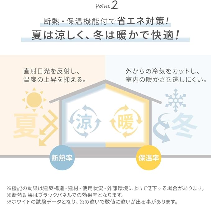 【断熱保温機能で、カーテンを開けても快適】昼厚地のカーテンを開けてもしっかり対策出来て、さらに1年を通して冷暖房の効果が高まり、夏は冷房、冬は暖房効果の効率アップ!気になる電気代にもアプローチ出来ます。