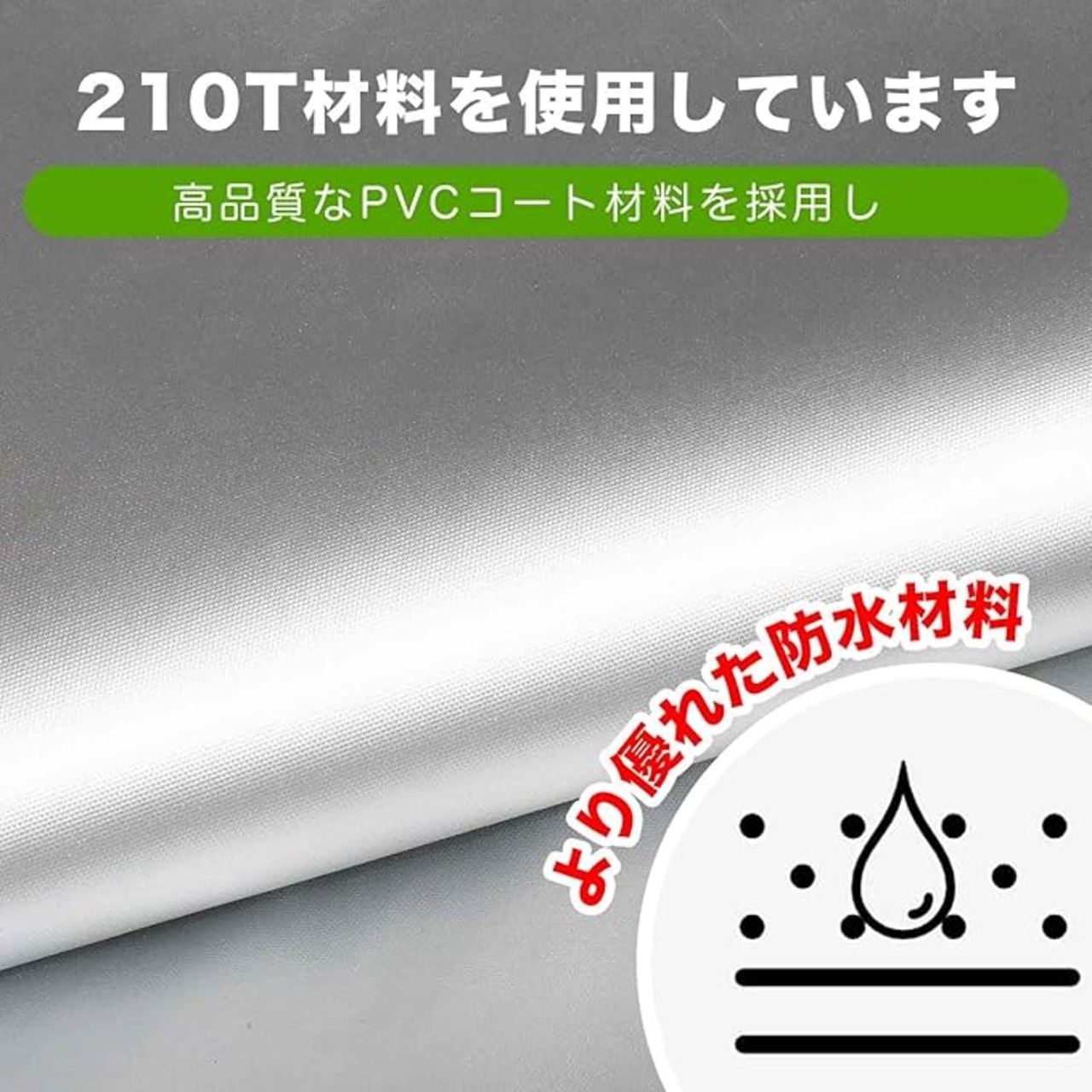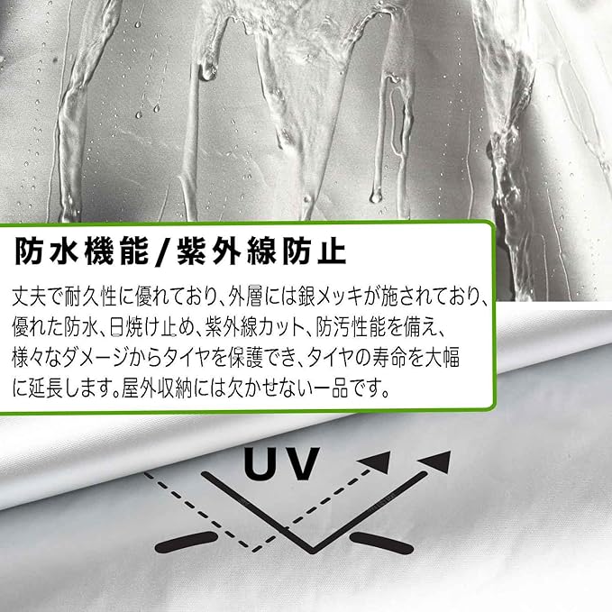 【雨・塵・紫外線遮断】 3層構造で酸性雨・砂埃・日焼けからタイヤを保護。シルバーコーティングが金属ホイールの腐食を防ぎ、UVカット率90%でゴム劣化を抑制。屋外保管に最適。