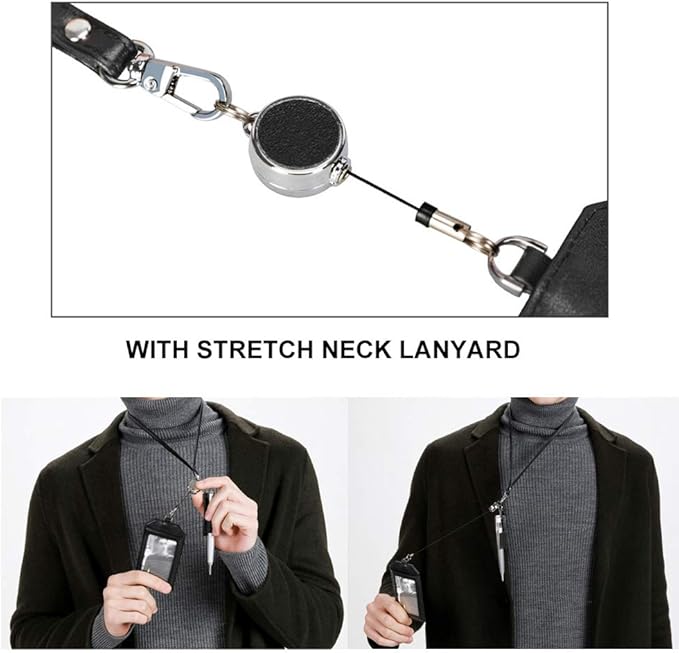 【リール付き&着脱可能ペンホルダー】:リールを伸ばして「最長40cm」手を離すと自動的に戻ります。背面ポケット二つありますのでsuicaなど便利に使えます。着脱可能なペンホルダーは様々なシーンで利用できます。
