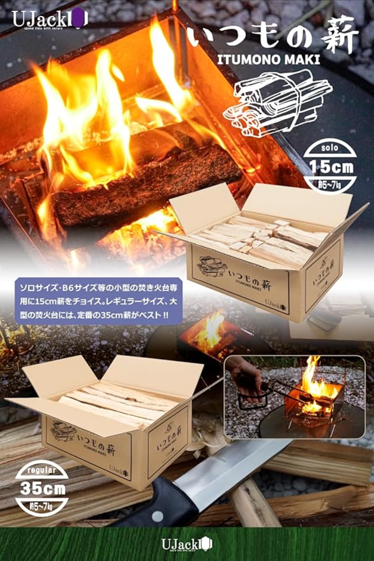 キャンプシーンをさらに快適に!「いつもの薪 - ITUMONO MAKI」は、焚火台のサイズや用途に合わせて選べる2種類の薪セットをご用意しました。15cmの「Soloサイズ」と35cmの「Regularサイズ」で、キャンプスタイルにぴったりの薪をお届けします。サイトに馴染むデザインパッケージは、初心者からベテランキャンパーまで幅広い層に支持されています。