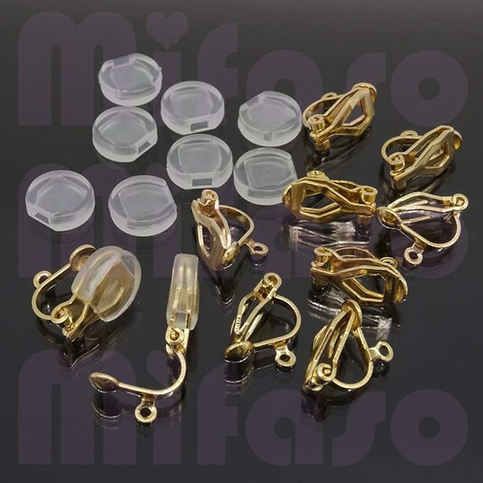 ゴールド・シルバーのクリップ式イヤリングパーツとシリコンカバーのセットです。耳たぶに挟むように使うタイプのイヤリングを作成するためのハンドメイド用金具です。