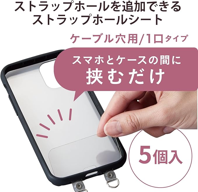 ■スマートフォンとケースの間に挟むだけでストラップホールを追加できる、2口タイプのストラップホールシートです。