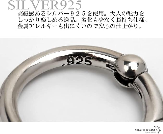 シルバー925は、銀含有率(純度)92.5%を示し、一般的に純銀として扱われています。サビや劣化等がほとんどなく金属アレルギーも出にくとされており、アクセサリーとして重宝される金属です。