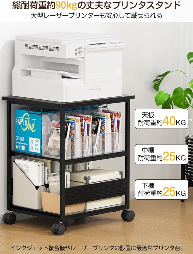 【総耐荷重90kg・大型プリンタ対応の頑丈設計】: プリンター台、オーディオラックとして使える3段サイドテーブルです。本体重量約12Kgあり、プリンタラックのサイズは幅60*奥行50*高さ70㎝です。A3、A4プリンタ対応可能、大型のレーザープリンタ対応もOKです。1.5㎝厚さの天板と2 2㎝のスチールフレームの組み合わせて、総耐荷重さ90Kgなので、上段にレーザープリンタ、中段にはコピー用紙や交換用トナーやインクなどの消耗品、下段にインクジェットプリンターやA4ファイルやラミネーターを置いて自由に収納できます。