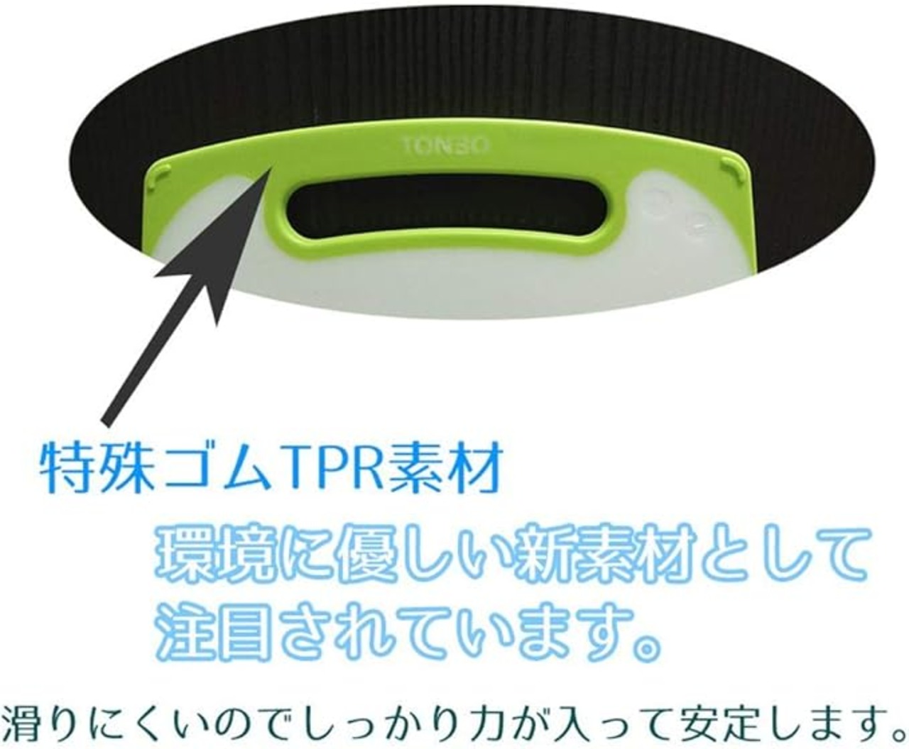 すべりを防ぐ、新形状の特殊ゴムでしっかりグリップ<br>安定して食材を切ることができる