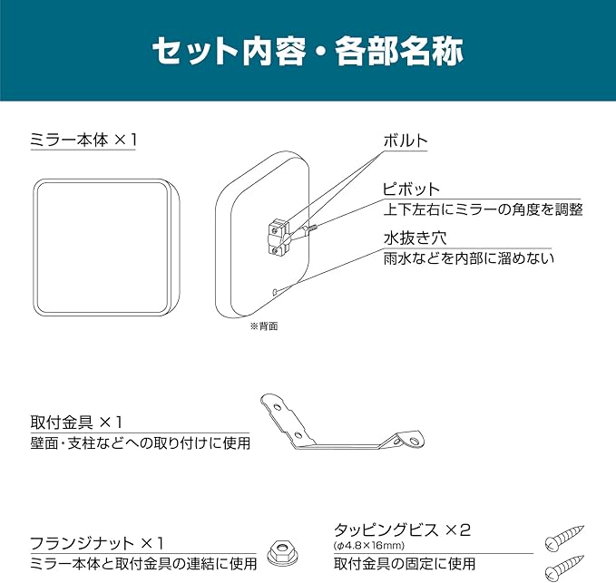ミラー本体 1、取付金具 1、フランジナット 1、タッピングビス 2