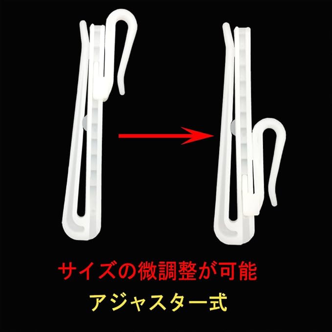 アジャスターフックのフック部分をカチカチと下へ下げて調節 上へあげたい場合は一番下まで下げて抜いてから差し込んで調節 フックを下げるとカーテンが短くなり、フックをあげるとカーテンが長くなります