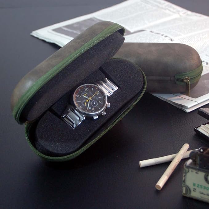 カーキ色のスタイリッシュなデザイン: 旅行や出張など、携帯性に優れた腕時計収納ケース