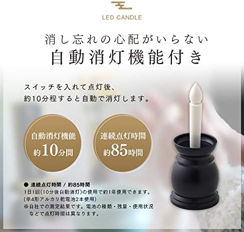 消し忘れの心配無し!火を使わないLEDローソク。自動消灯で安心してお使い頂けます。小さなお子様がいるご家庭や一人暮らし、ペットがいるご家庭に。ミニサイズで、コンパクトな仏壇、神棚にも。約10分間の自動消灯機能付。