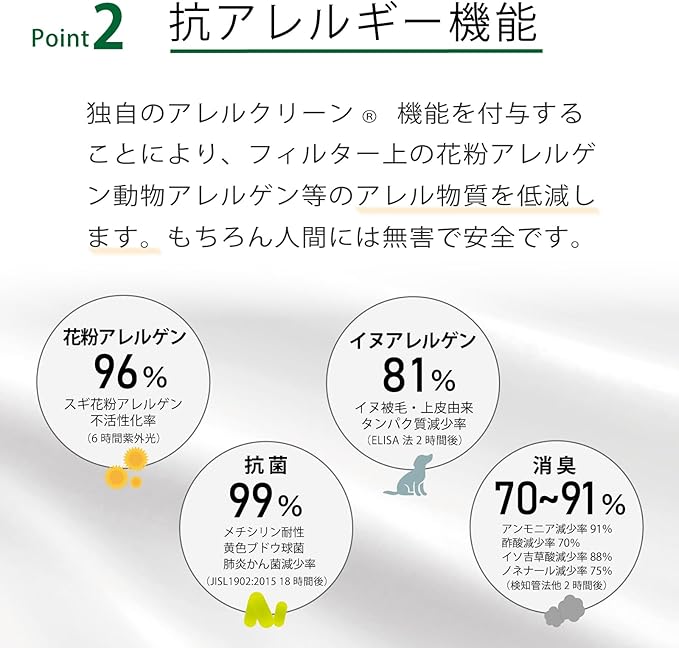 【抗アレルギー機能】独自のアレルクリーン機能を付与。フィルター上の様々なアレルゲンを低減します。