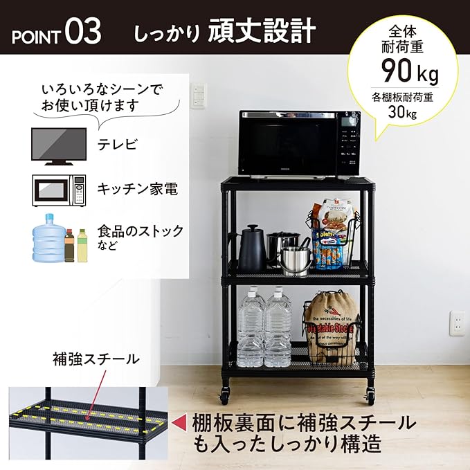 山善(YAMAZEN) ラック 棚 3段 キャスター付き 全体耐荷重90kg (高さ調節可能/荷重に強いキャスター) 幅60 奥行39 高さ90cm キッチンラック 収納ラック 組立品 ブラック MNR-90603CJ(BK)