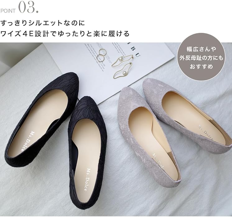 幅広4E設計でゆったりラクラク!ポインテッドトゥパンプス ふわふわインソールでやわらかな履き心地!内張りもクッション性に優れたメッシュ素材で優しい足当たり
