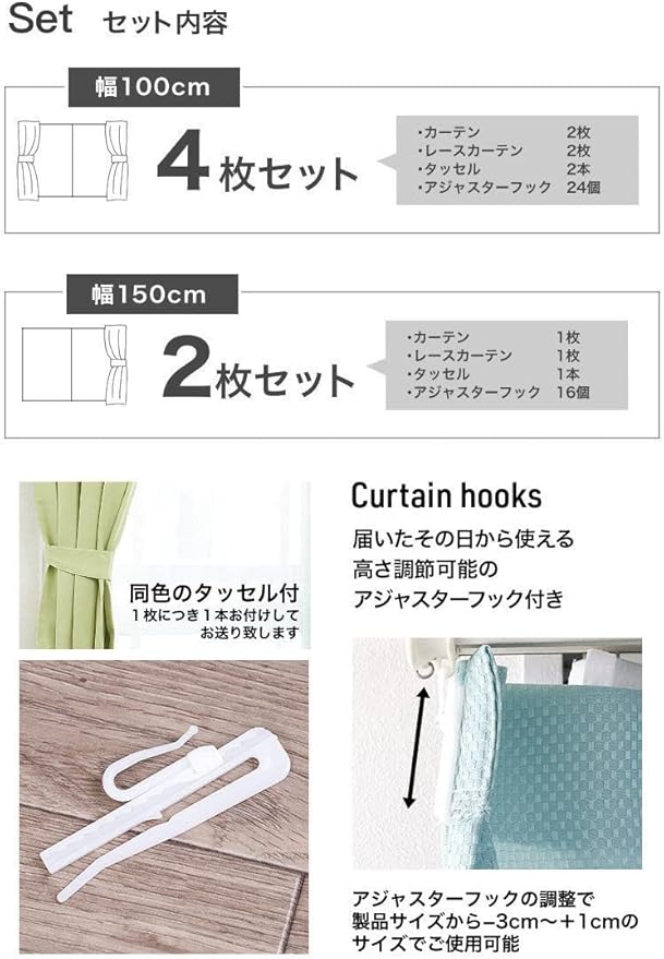【付属品】高さ調節可能なアジャスターフック付き(製品1枚に付き6個)。遮光カーテン用タッセル2本付き。
