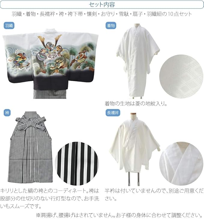 羽織と着物の生地は菱の地紋入り。高級ポリエステル素材を使用しているので、化繊ながらもしなやかで肌触りの良いお品です。お子様の着物は、成長することを前提に大きめに作られています。肩上げ・腰上げなどの身上げには「お子様のこれからの成長を願う」という意味があります。お子様の身長や裄に合わせて、肩上げ、腰上げをしてご着用ください。