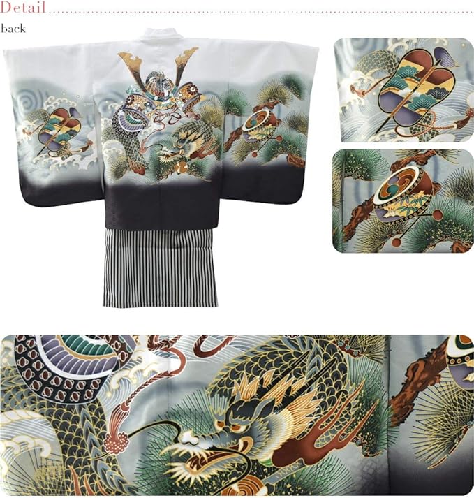 羽織の背には、成長を祈って兜と龍が描かれています。兜は本来、武士の身を守るための物。病気や災害から子供を守り、丈夫に育って欲しいという意味があります。龍は、万能を有する聖獣。天に昇る姿から出世や飛躍を願う吉祥文様です。