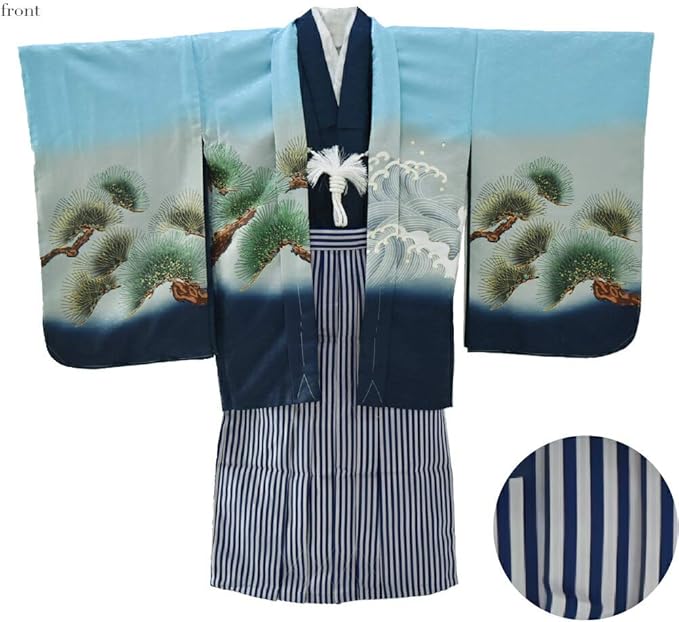 サイズ(cm) 羽織 身丈:約65 袖丈:約57 裄:約55 着物 身丈:約105 袖丈:約56 袖巾:約29.5 裄:約53.5 前巾:約19 後巾:約23.5 長襦袢 身丈:約70 袖丈:約55 裄:約51.5 前巾:約19 後巾:約23 袴 袴紐下丈:約60 袴下帯 巾:約6 長さ:約218 お守り 巾:約5 縦:約8.5 懐剣 巾:約5 長さ:約18 扇子 長さ:約18 雪駄 長さ:約19.5 巾:約8