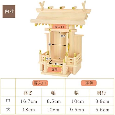 中神明:高さ40.5cm 幅34.5cm 奥行21cm 扉入口 高さ16.7cm 幅8.5cm 内部 高さ27cm 幅11.8cm 奥行5.7cm