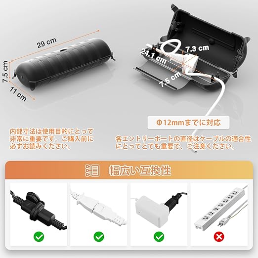 サイズ:外寸29 11 7.5cm、内寸24.1 7.5 7.3cm、重量300グラムです。 直径Φ1〜12mmの各種電線、フラットケーブルおよび編み込みケーブルに対応しています。 電源タップには対応していません。