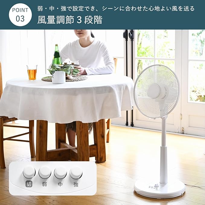 【リビング扇風機】ここちよい風を送ってくれるスタンダードタイプのリビング扇風機。フラットガードでシンプルなデザインがどんなインテリアにも馴染みます。ダイニングでは高め寝室では低めなどシーンに合わせて高さ調節も可能です。