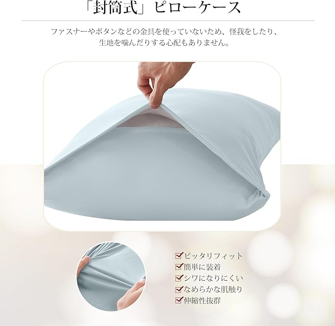 【オールシーズン使える】枕カバーは肌に直接触れるものだから、柔らかな肌触りと優れた吸水性を兼ね備えた枕カバーです。抗菌防臭加工で、夏の汗対策や冬の寒さ対策に効果があり、一年中オススメです。シワにならずにぴったりフィット、アイロンいらずキレイなベッドに変身するのびのび枕カバーです。