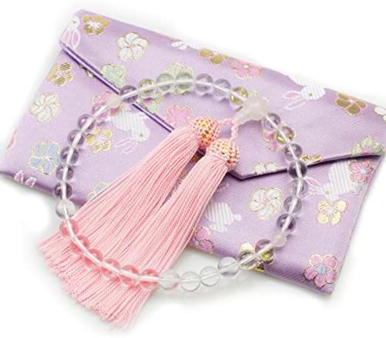 【落ち着いたピンク】色はピンクですが、落ち着いたピンクです。渋い数珠を嫌がる10代20代などの若い方に特におススメしますが、愛らしくエレガントな数珠をお望みの年配の方にももちろん最適です。