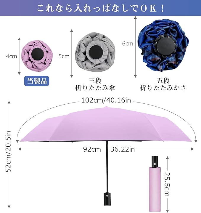 【超軽量・折り畳み傘】DONTWETの折り畳み日傘は、190gという軽さと、わずか4cmというスリムなサイズで、バッグにかさばらずに簡単に収納できます。また、頑丈な航空機用アルミ合金製の中棒と6本の傘骨にはグラスファイバーと航空機用アルミ合金を使用しており、耐久性にも優れています。通勤や通学、旅行先でも手軽に紫外線対策ができ、バッグや車に常備すれば全天候に対応できる、男女兼用の超コンパクトな日傘です。