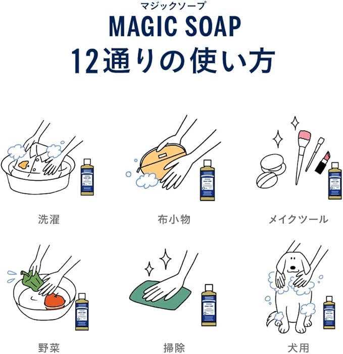 【マジックソープの処方変更に伴い、2024年1月より順次全成分が変更になります。 お手元に製品がある場合は、製品ラベルで全成分をご確認ください。】 水、ヤシ油*†、パーム核油*†、水酸化K、オリーブ果実油*†、香料、アサ種子油*、ホホバ種子油*、クエン酸、トコフェロール *オーガニック成分 †フェアトレード認定成分 ※全て天然由来成分