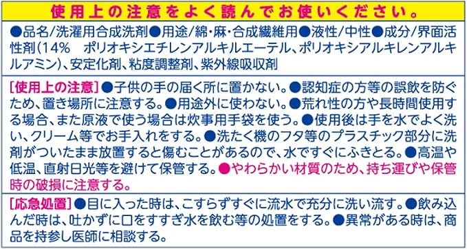 原材料: 界面活性剤(14% ポリオキシエチレンアルキルエーテル、ポリオキシアルキレンアルキルアミン)、安定化剤、粘度調整剤、紫外線吸収剤