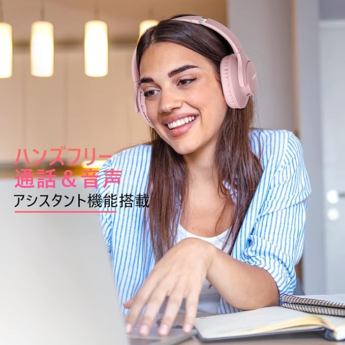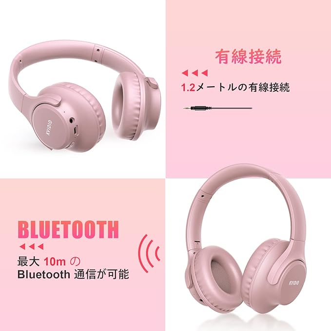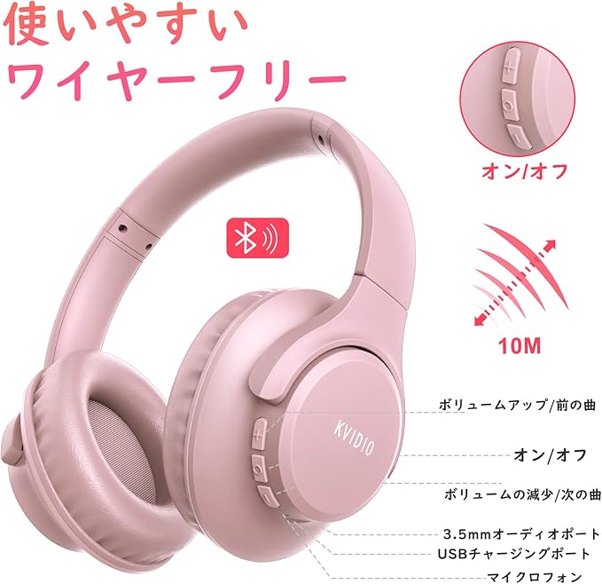 ワイヤレス ヘッドホン KVIDIO Bluetooth 5.4 55時間再生 40mm HD ドライバーユニット オーバーイヤーヘッドホン マイク内蔵 ヘッドホン 有線 無線 両用 遮音 密閉型 ハンズフリー通話可能 ブルートゥース ヘッドフォン ブラック (ピンク)