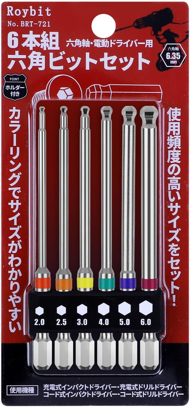【商品仕様】サイズ:対辺2/2.5/3/4/5/6 100mm(ボールポイント六角ビット各1本)。セット内容:6本組。シャンク径:6.35mm。素材:クロムバナジウム鋼。硬度:HCR60 。