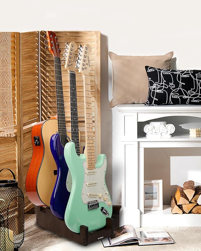 【安全な間隔設計】GS-Lシリーズの木製ギタースタンドでは、3つのギターを適切な位置に置くことができ、衝突を避けることができます。壁に近づけて置くこともでき、ハンドル付きのエレキギターにも適しています。