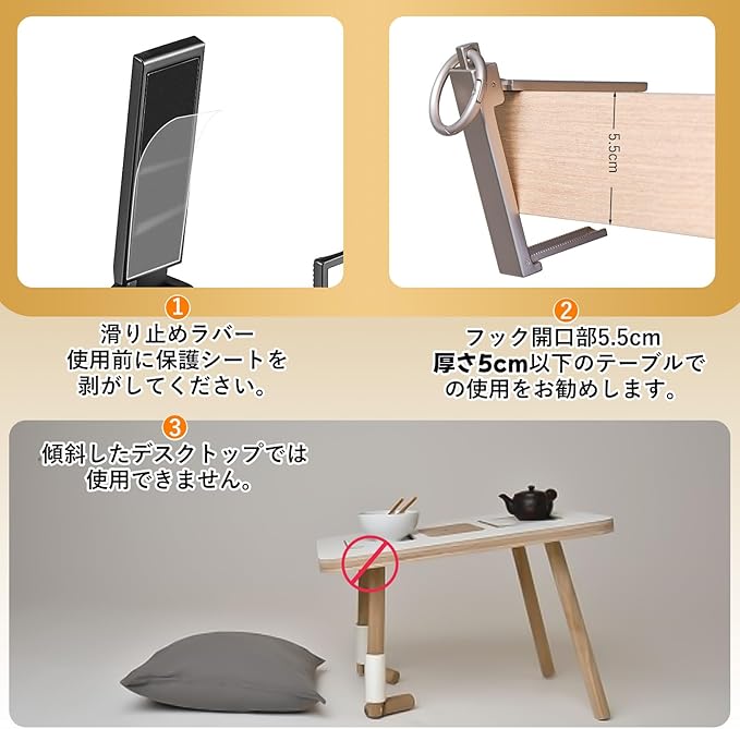 【安定性】テーブルフックが台面に接触する部分には滑り止めのラバーパッドが装備されており、フックの安定性を確保し、テーブル面の傷を防ぎます。【ご注意】使用前にラバーパッドの保護シールを剥がしてください。
