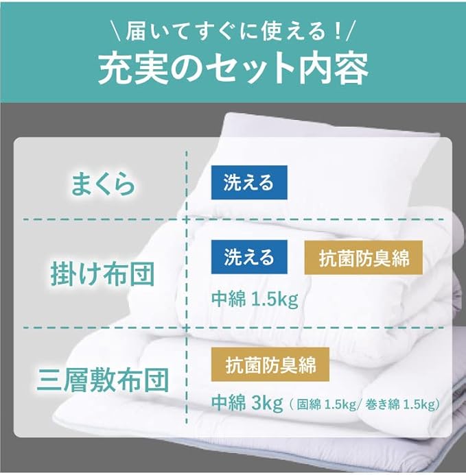 【材質】 ■掛け布団 表地:ポリエステル65%綿35% (TC 中袋付) 無地 裏地:ポリエステル65%綿35% (TC 中袋付) 無地 詰め物:ポリエステル100%(帝人マイティートップ2 50%中空糸 レギュラーポリエステル50%)1.5kg ■敷布団 表地:ポリエステル65%綿35% (TC 中袋付) 無地 裏地:ポリエステル65%綿35% (TC 中袋付) 無地 詰め物:巻綿:ポリエステル100%(帝人マイティートップ2 50%中空糸 レギュラーポリエステル50%)1.5kg 中芯:ポリエステル100%固綿 1.5kg ■枕 表地:ポリエステル65%綿35% (TC 中袋付) 無地 裏地:ポリエステル65%綿35% (TC 中袋付) 無地 中綿:ポリエステル100% 0.5kg 【サイズ・重量】 ■掛布団 150X210cm(中綿重量:1.5kg)6ヶ所ループ付き ■敷布団 100X210cm(中綿重量:3.0kg 巻綿1.5kg 固綿1.5kg) ■枕 43X63cm(中綿重量:0.5kg) 日本製(生地+染めは、中国企画です)