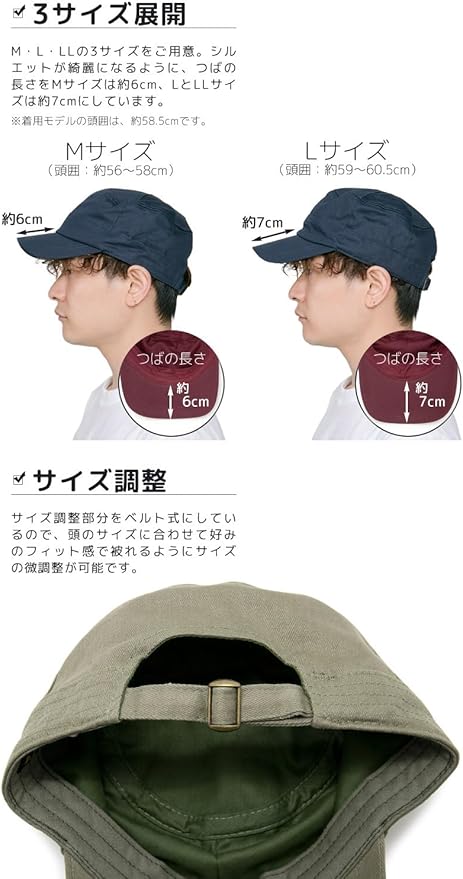 Mサイズ:サイズ表記56~58cm(頭囲:約56~58cm[後部ベルトでサイズ調整可能]、高さ:約11cm、つば:長さ約6cm・幅約18cm)、 Lサイズ:サイズ表記59~61cm(頭囲:約59~61cm[後部ベルトでサイズ調整可能]、高さ:約11cm、つば:長さ約7cm・幅約18cm)、 LLサイズ:サイズ表記62~64cm(頭囲:約62~64cm[後部ベルトでサイズ調整可能]、高さ:約12cm、つば:長さ約7cm・幅約18cm)