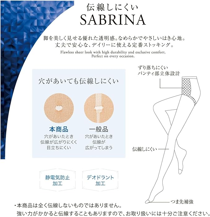 ・パンティ部立体設計 ・伝線しにくい ・静電気防止加工 ・デオドラント加工 ・つま先補強 ・3足セット