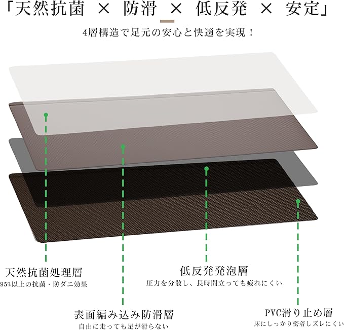 低反発性能、驚きの快適さ——柔軟かつ高密度なPVCフォームを採用し、同類製品の1.5倍に相当する低反発力を発揮。足裏にかかる圧力を吸収・分散し、立ち仕事による疲労を大幅軽減。長時間の料理や洗い物も快適にこなせる、主婦・主夫の強い味方!