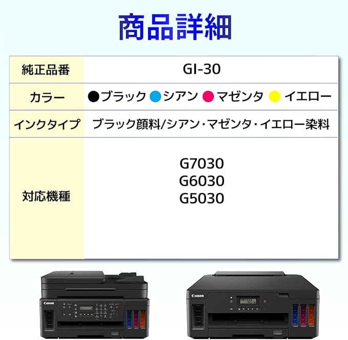 Canon GI-30C / GI-30M / GI-30Y シアン・マゼンタ・イエロー対応の互換インクボトルになります。 Canon純正品ではございません。