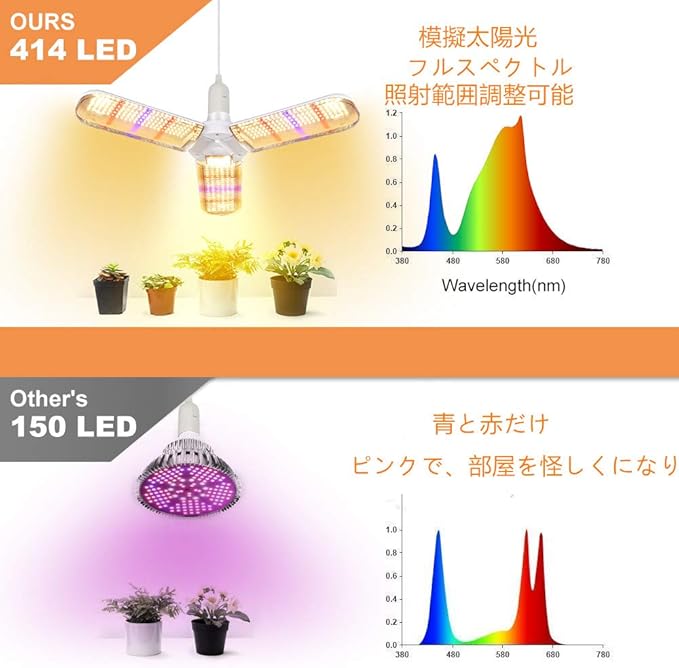 省エネ&光量充分:高品質LED素子を採用し、実際消費電力は30ワットですが、100W相当のパワーがあります。低い消費電力で、電気代が高い必要がありません。414個の明るいLEDチップを搭載して、明るくて、充分な光が植物に照射します