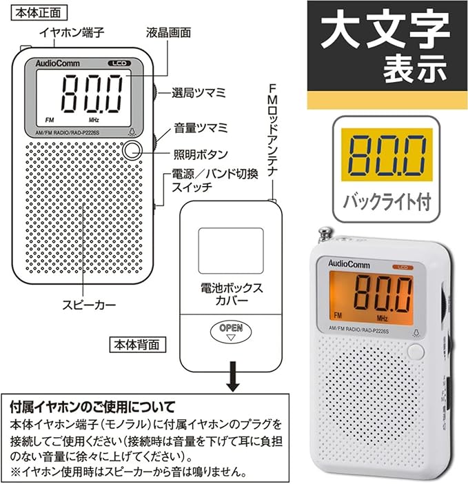 【 特 長 】 ● AM/FM、ワイドFM(FM補完放送)対応 ● 液晶画面は大文字表示、バックライト付で見やすく選局がしやすい。 ● FMロッドアンテナ ● モノラル受信