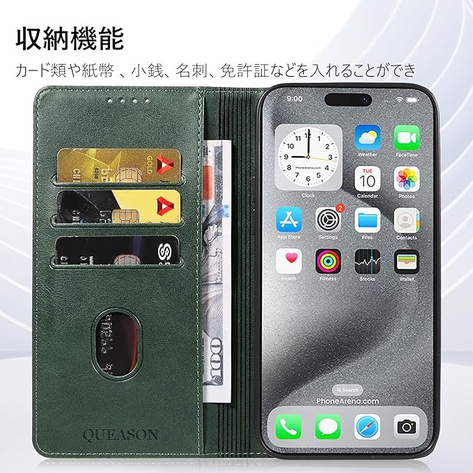 QUEASON【iphone 16 pro 用 ケース 手帳型】マグネット式 いphone16pro 用 ケース 手帳型 スタンド機能 iphone16pro ケース 手帳型 カード収納 アイフォン16pro ケース 手帳型 携帯カバー iphone 16pro ケース 手帳型 耐衝撃 落下防止 防塵(グリーン)