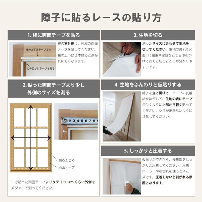帝人の機能糸「涼しや」&「エフコット」を編み込んだ光と風を通す多機能なレース障子です。夏は遮熱効果、冬は保温効果があります。また花粉キャッチ機能で外から室内への花粉やホコリの進入を抑えます。レース生地ですので、通気性や採光性に優れており、破れにくい素材なので障子紙に比べると長持ちします。取付方法は、桟のサイズに合わせて、カットしてお使いください。詳細な取扱説明書(レース障子の貼り方)が付いていますので、作業が不慣れな初心者の方でも安心。紙と違って破れないので、ゆがんだりたるんだりしたら貼り直しが出来ます。細幅の両面テープが2巻付いてます。水のり等を使わないので準備も簡単で汚れません。 ※障子レース生地を貼る際、生地の表と裏を間違わない様にしてください。(※光沢がある面が屋外側になります。)梱包状態のたたみシワが気になる場合はアイロンを掛けてから貼ってください。