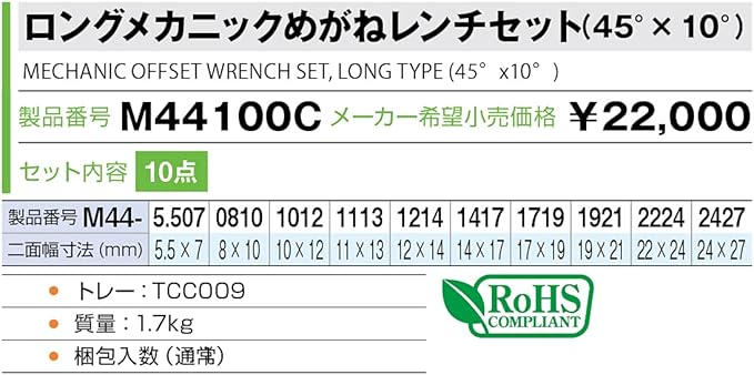 トネ(TONE) ロングメカニックめがねレンチセット(45 10 ) M44100C 内容10点