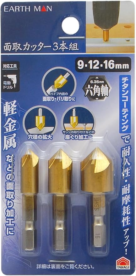 高儀(Takagi) EARTH MAN 面取カッター 3本組 9・12・16mm チタンコーティング 耐久性 耐摩耗性 4907052356160