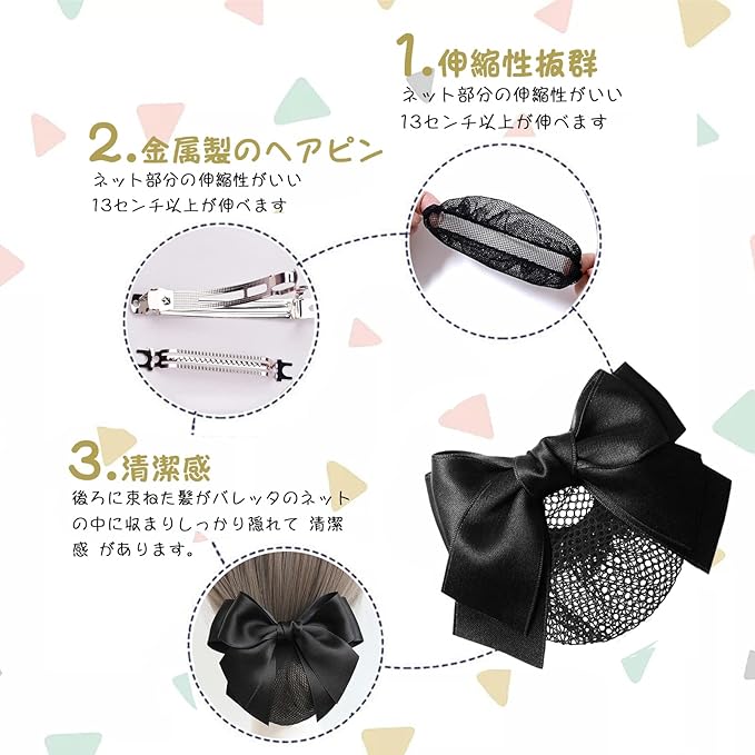 【ネットを取り外すことが可能】 2Wayでお得な蝶結びまとめ髪ネットです。オンの場合、ネット付きで、大人の信頼感を与えます。使い方は超簡単です!?髪をひとつ結びにし、ゴムで結ぶ。ゴムの上にバレッタを留めます。?髪を手でお団子状にし、ネットの中に入れます。?ネットオフの場合、ネットを取り外して、可愛いボウヘアアクセサリーに変身です!