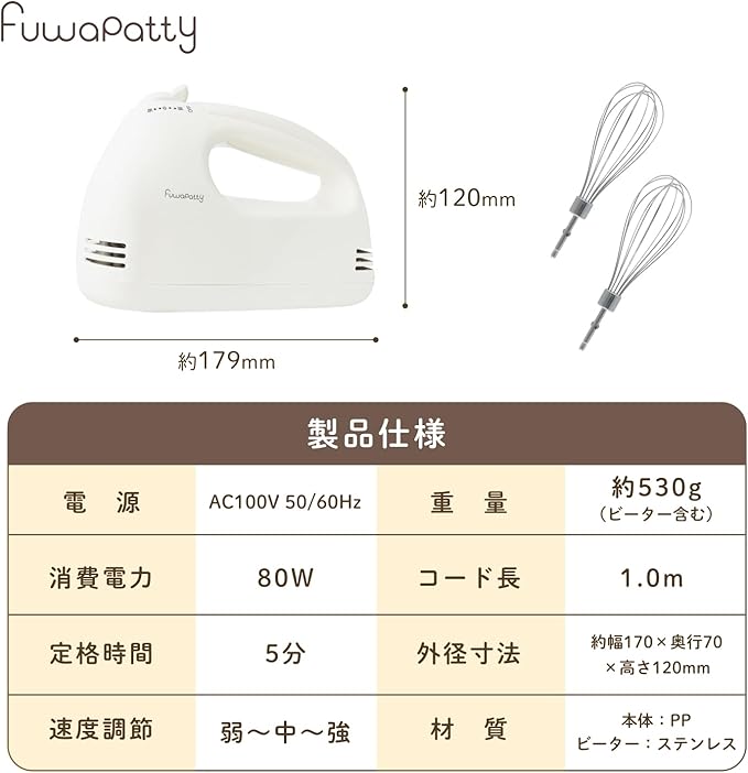 【製品仕様】電源:AC100V 50/60Hz、消費電力:80W、定格時間:5分、速度調節:弱〜中〜強、重量:約530g(ビーター含む)、コード長:1.0m、外径寸法:約幅179 奥行70 高さ120mm、材質:本体:PP、ビーター:ステンレス、保証期間:HOT保証期間1年