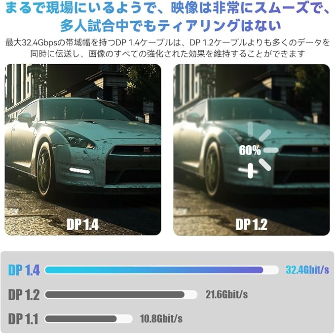 Displayport ケーブル 1.4は、高純度の無酸素銅コアを使用し、最大8K @ 60HZの解像度をサポートし、displayport ケーブルは4K @ 120HZとも互換性があります。dp 1.4ケーブルは、最大240Hzの解像度をサポートし、動的HDR / DSC / FECをサポートし、32.4Cbpsの帯域幅伝送をサポートします。高音質と高精細画質の2層の組み合わせを実現し、動画再生・送信時の視聴を存分に楽しむことができます。ゲームでは、リフレッシュレートが高いということは、1秒あたりの出力フレームレートが高いことも意味します。これにより、ゲーム画面がスムーズになり、スタックしなくなります。