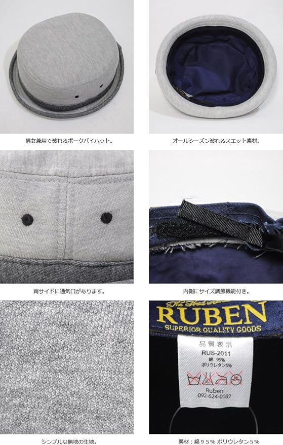 特徴:大きいサイズ(XLサイズ)でオールシーズン被れるスエット素材のポークパイハット。つば先に同系色のパイピングが施してあります。帽子の内側にサイズ調節機能が付いており、男女兼用で被って頂けます。