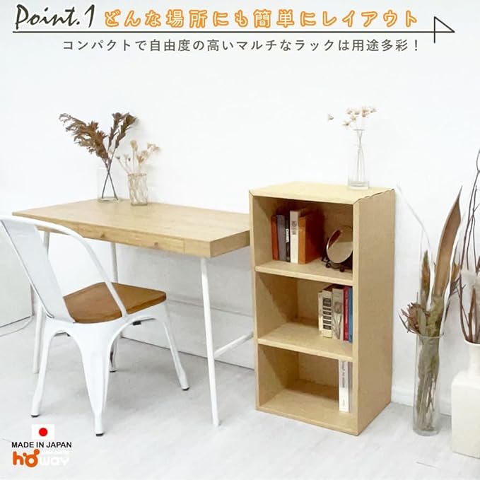 地震対策に!超軽量棚で安心!安全!3段それぞれの高さが約27.5cmです。 段ボール&強度設計の棚ですので、全棚に本や文具を並べても壊れることはありません。 複数使用して、自由な棚をカスタマイズできます。 ・組み立ても簡単です。(約20分) ※個人差もありますが、1人で組み立てた時の作業時間です。 「組み立て動画」と「組立説明書」に目を通してから作業するとスムーズです。 ・素材は段ボールを使用していますが段ボールとは思えない様な見た目です。 ・軽いので移動が楽チンです。 ・処分が簡単です。 ・段ボールは再利用が可能なのでとってもエコです。 ・地震の時に倒れてきても大きな怪我になりにくいので安心です。