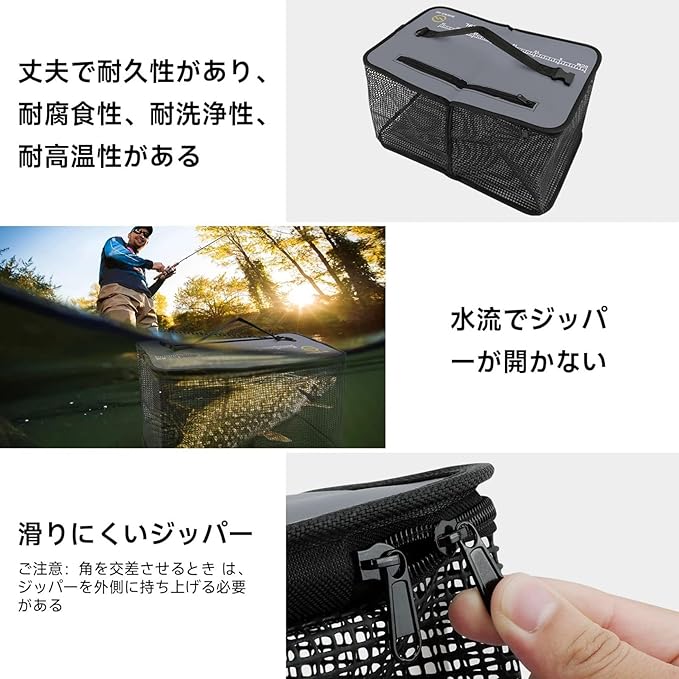 製品の機能:釣った魚を活かしたままキープ! 釣った魚を水中で活かす網状の入れ物で、フタにはウレタン素材を内蔵しそのまま水に浮かせて使用することができます。フタにウレタン素材を採用し本体自体が水面に浮く仕様!